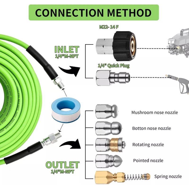 - Universal Quick Connect : Both ends of the jetter hose is 1/4“M-NPT, equipped with pressure washer coupler convert metric M22 14mm female NPT thread to 1/4’’ Female NPT. for Pressure washer gun, pump connections, sewer jetter hose and nozzles. The connections are super smooth and tight.