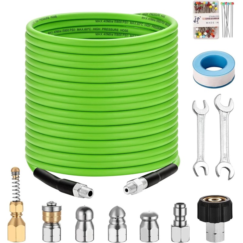 - Comprehensive Sewer Jetter Kit : Our pressure washer Sewer jetter kit comes with everything you need for easy use, including: 1 × 75ft sewer Jetter hose,1 × button nose sewer jet nozzle (orifice 4.0), 1 × rotating sewer jetter nozzle(orifice 4.5), 1 × Side hole sewer jetter nozzle,1 × corner sewer nozzle, 1x Spring nozzle, 1 × M22 female to 1/4’’ female NPT coupler,1 × 1/4’’ quick connect plug, 1x waterproof tape, 2x spanners, 1x box of pearl corsage pin.