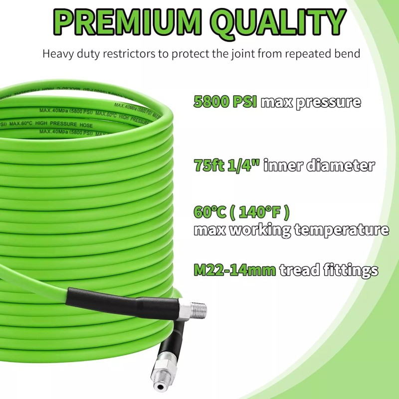 - Constructed for Strength and Durability : Pressure washer drain jetter hose withstands pressures up to 5,800 psi, hydrojet drain cleaner hose is made of thermoplastic polyester tubing reinforced with chemically bonded 1/4 "high toughness polyester braided fabric, oil, anti-corrosion, oxidation and wear resistant, and can be combined with any brand of pressure washer.