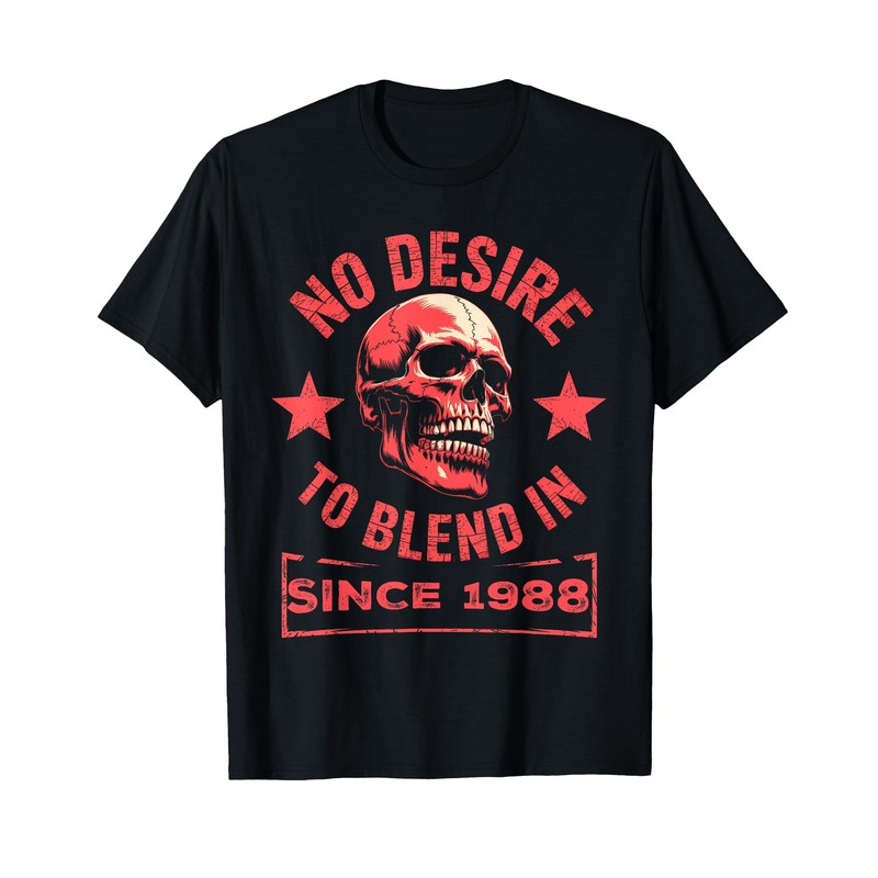 • Celebrate your year with bold character. This skull design features the phrase “No Desire to Blend In – Since 1988.” Great birthday tee for family and friends.