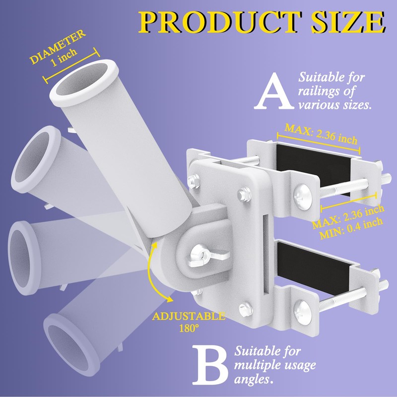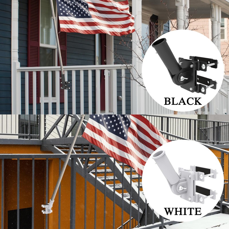 1. Installation method: There are two installation methods for the detachable flagpole bracket. The first type can be installed on circular poles ranging from 0.4 inches to 2.36 inches in size, such as railings, RVs, boats, gardens, etc. The second type can be fixed to flat walls or wooden boards with screws, ensuring that the wall thickness is greater than 0.4 inches. 2. High density material: The bracket is made of aluminum, which has sufficient corrosion resistance and waterproof function. It is lighter and more stable in weight, will not deform the railing, and can be used outdoors for a long time. 3. Anti slip silicone pads: We are equipped with four silicone pads made of high-quality silicone and fixed with adhesive 3M backing tape, which can make the bracket more anti slip and provide better protection. 4. 180 degree rotation: The flagpole bracket can rotate 180 degrees, and you can adjust the angle according to your own needs to meet various needs. 5. Easy installation: We have detailed instructions to help you assemble and apply it faster. We have two colors, black and white, and you can choose your favorite color.
