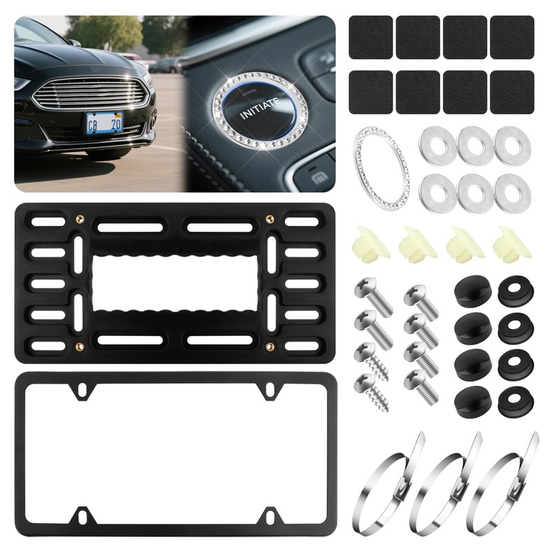 - You Will Receive: Included license plate mounting bracket*1, license plate frame*1, ties*3, start button cover trim ring*1, screw lower cover*4, screw upper cover*4, short flat head screws*4, etc. The included push start button trim ring can decorate your push start button
