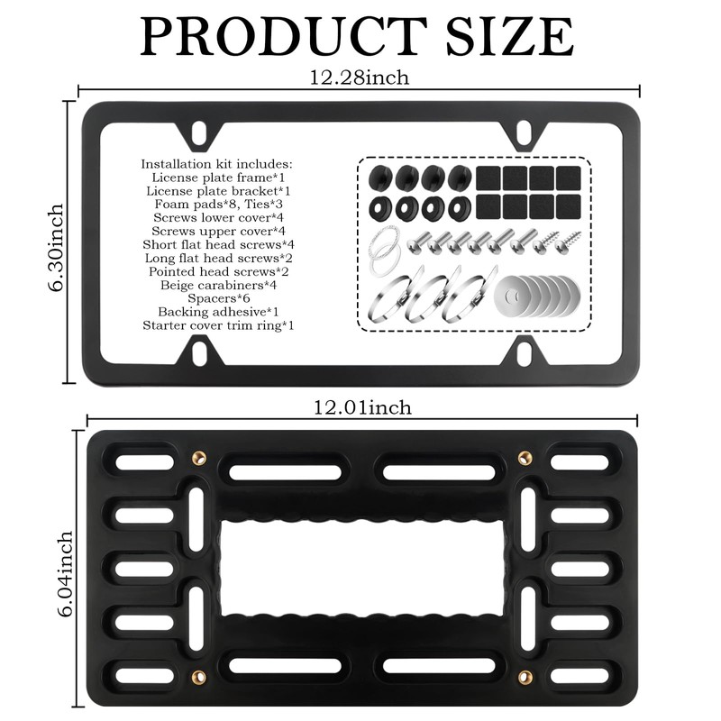 - Size: Total size of license plate frame is 12.28*6.3*0.2 inch, total size of front license plate bracket is 12.01*6.04*0.39 inch. Combination kit of bracket + license plate frame, which keeps the license plate from scratching the car's paintwork after installation. More size reference details