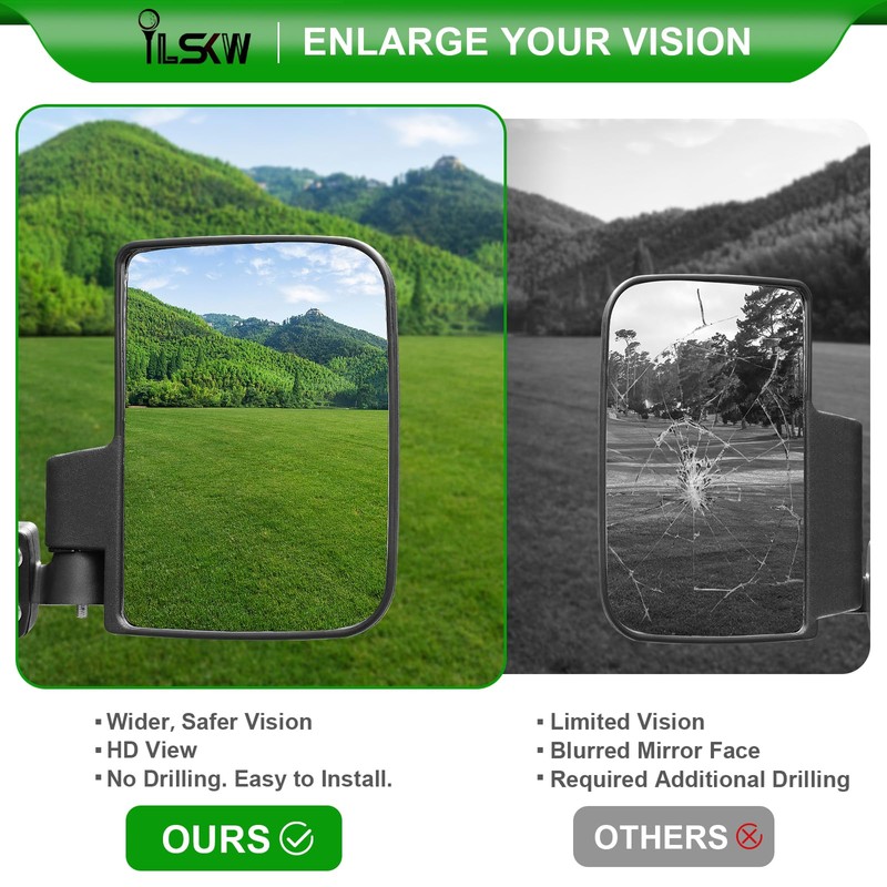 - Super Wider Clear Vision: The universal golf cart side mirrors is curved design to provide 180 degree panoramic view to reduce blind spots and enhance your driving safety. Will not affect windshield folding