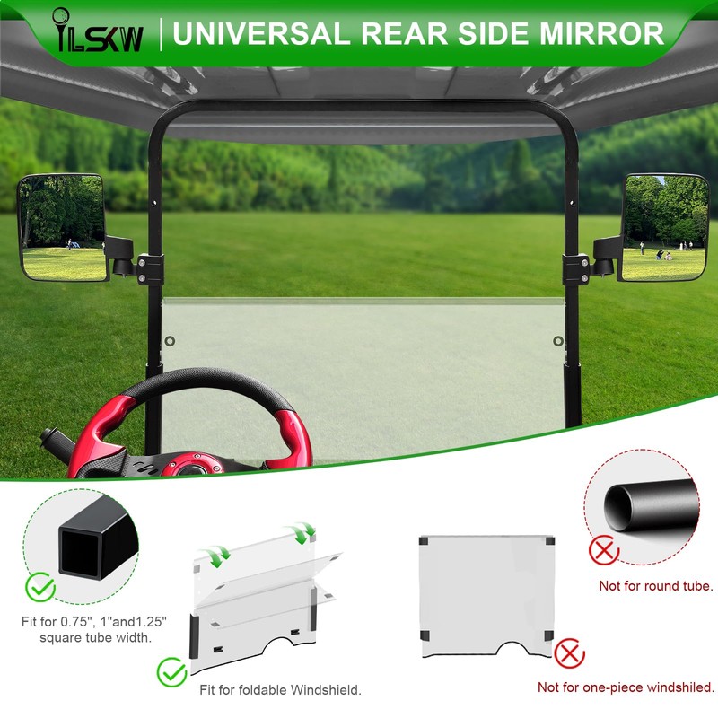 - Universal Golf Cart Side Mirrors: This side mirror fit for golf carts with 0.75/1/1.25 inch square tube bracket with foldable windshield, such as EZGO TXT, RXV, Freedom, Club Car DS, Precedent, Tempo, Onward, Yamaha, G2-G29, Star, Zone Carts and so on (Fit 0.75/1/1.25 inch square tube only)