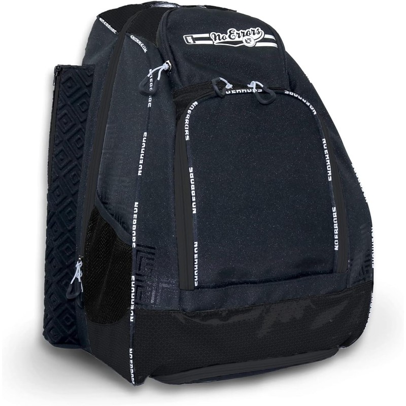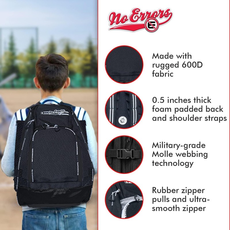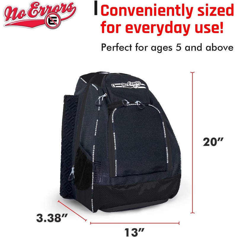 About this item THE NO ERRORS ROOKIE BASEBALL BACKPACK: When a player's mind is at ease about their equipment, it helps their entire focus stay on the game. No Error Sports has skillfully designed a bag of all baseball bags, the convenient and lightweight RBP Rookie Baseball and Softball Backpack. It carries everything you need for daily practice comfortably on your back - helmets, balls, bats, gloves, water, and even your phone and jewelry. ALL-IN-ONE BASEBALL BAG FOR KIDS: Designed to be the perfect backpack for baseball players, the bag has precisely sized spaces for every piece of equipment. It holds it ALL while remaining lightweight and easy to carry. This Baseball and Softball Backpack has 0.5 inch thick comfortable foam back padding, padded shoulder straps, as well as a molle webbing technology to ensure that you'll carry everything but feel almost nothing. FITS YOUR BATS, HELMETS, AND SHOES: The No Error Rookie Baseball and Softball Backpack is designed to secure all your big gear. This everyday baseball backpack stores your helmets in the oversized main compartment, 2 bats in its structured neoprene protective bat-sleeves, balls in its quick-access accessory pocket, sweaty shoes in the vented pocket, your phone and jewelry in a classy velvet protective pocket, and bottles in the two exterior mesh pockets with elastic straps. HIGH-QUALITY BASEBALL BACKPACK: Our Baseball and Softball Backpack will seamlessly blend into your practice routine and make it extremely convenient for you to carry and access your gear. It comes with fence hooks, rubber zipper pulls, smooth lubricated zipper, padded shoulder harness with a built-in carrying handle. WEAR AND TEAR RESISTANT BACKPACK: Whether you're traveling long journeys or using it every day on the field, the No Errors Baseball and Softball bag survives the everyday push-and-shove with its durable 600D material. It's made with a fabric that's easy to wash and colors that don't fade away easily, ensuring a long period of usage. It's produced under the highest quality control standards, ensuring that you get a true top-of-the-line baseball bag. |