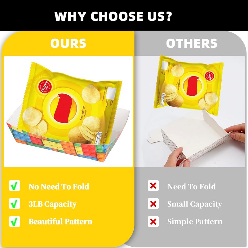 • Perfect for Building Block Theme: Featuring a vibrant Building Block Design, these paper trays are the perfect addition to your Building Block theme party, enhancing the festive atmosphere and delighting guests