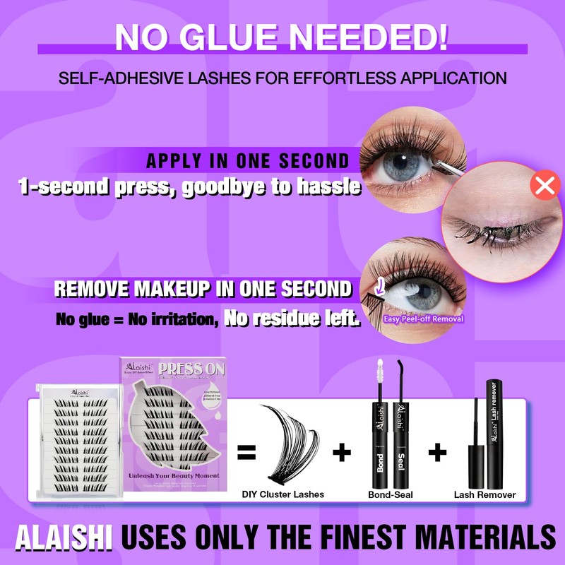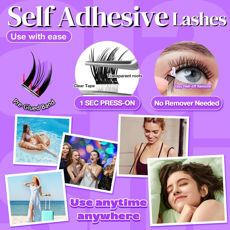 - 【Glue-Free, Lash On in 1 Sec】– Pre-Coated Bold Lashes + Pro Tweezers! No glue needed! No Residueo! Our lash clusters kit includes pre-applied medical-grade adhesive and angled tweezers for instant D-Curl volume. Just peel, press with tweezers, and get bold fluffy false eyelashes in seconds, effortless removal with zero sticky traces!—ideal for beginners, gym days, or last-minute party fake eyelashes!