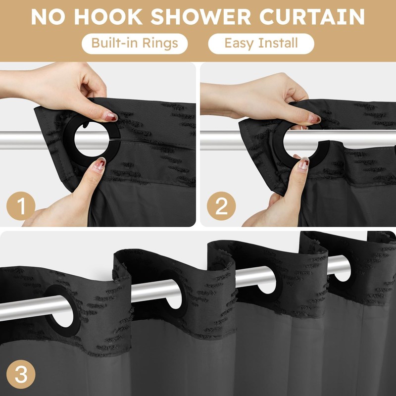 FADOTY No Hook Shower Curtain and Liner Set, Black Snap in Shower Curtain Ringless Chevron Tufted Cloth Waterproof Washable Fabric Bath Curtain with See Through Top Window for Bathroom Hotel 71" x 74"