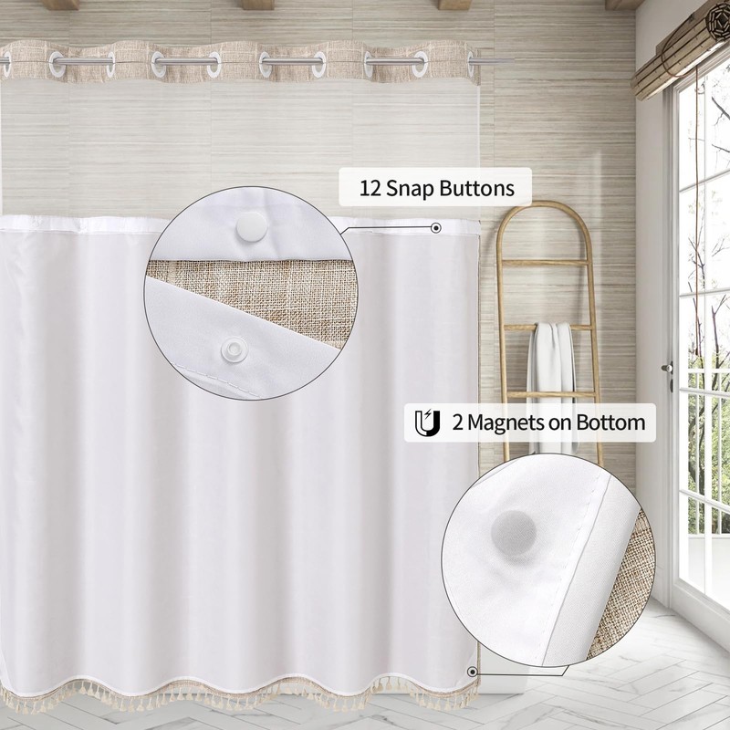 No Hooks Required Farmhouse Shower Curtain with Snap-in Liner - with Window & Magnets, Boho Cotton Linen Fabric Shower Curtains with Tassels for Rustic Bathroom Decor, Tan/Taupe, 72 x 74