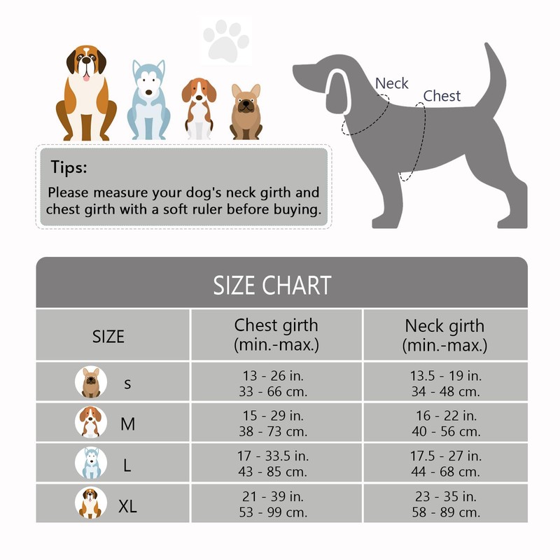 • Safe and Perfect Control - Super bright Reflective Strips ensure a SAFE walk in the dark and at night. A soft neoprene padded sturdy handle on the back to help you grab and control your dog in an emergency, and also help it to get in the car or steps. Please DO MEASURE your dog to get the right size before purchase!