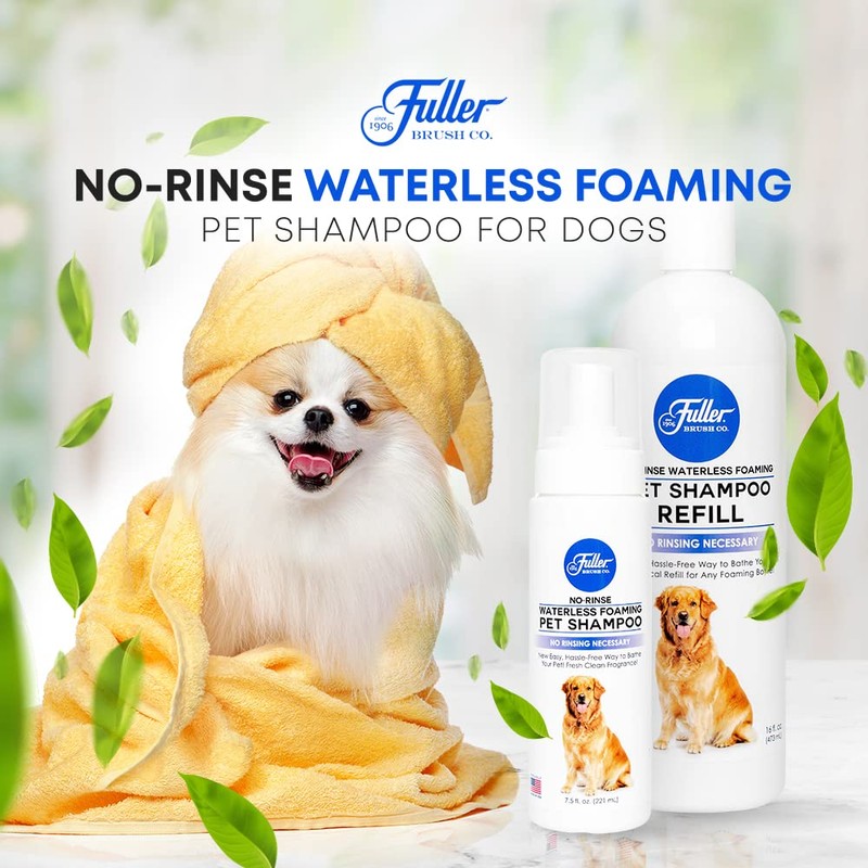 - Cleans, Conditions and Moisturizes: Fuller’s No-Rinse Waterless Foaming Pet Shampoo is a better and quicker way to keep your dog clean. The foam is easy to apply and spread on your dog’s dry coat, cleaning, conditioning and moisturizing in one easy step.