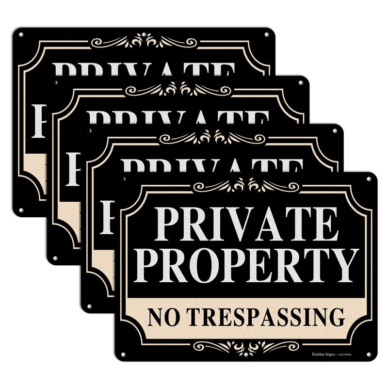 - Nice looking: Our Private Property No Trespassing Metal signs are designed in three contrasting colors of white, black and gold, making them more visually attractive and elegant than the others. They states your point against trespassers in a polite way. They fits in very well with your house which is in an upscale neighborhood.