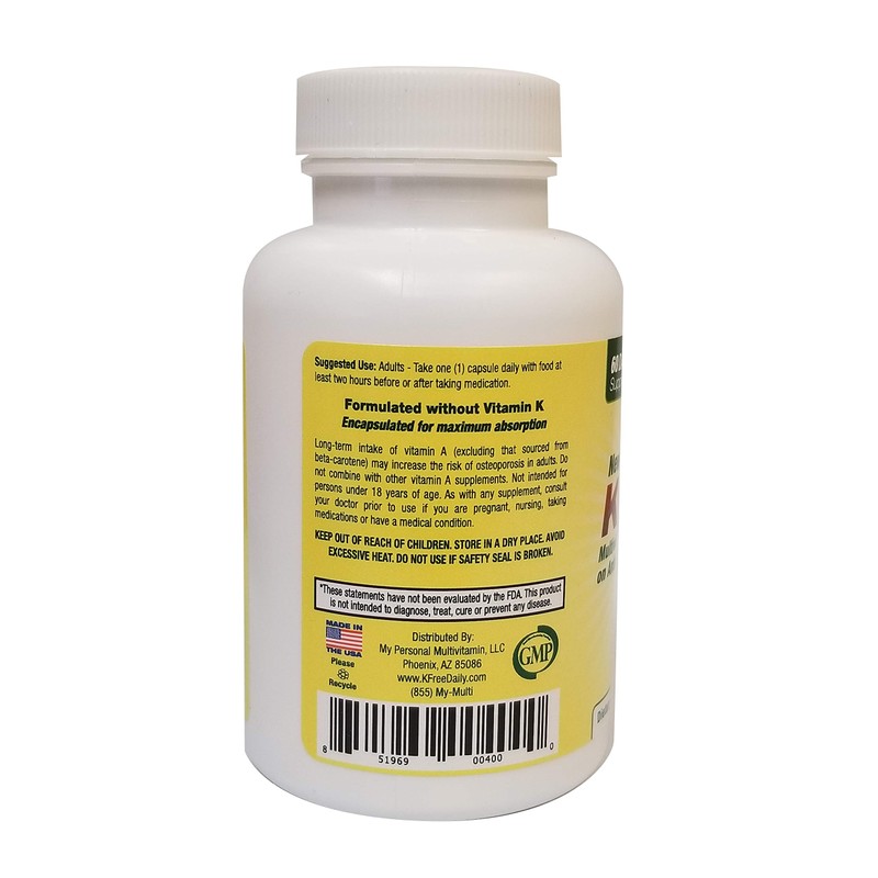 K Free Daily is a complete multivitamin without vitamin K or other nutrients shown to affect INR or the way your blood forms a clot.
