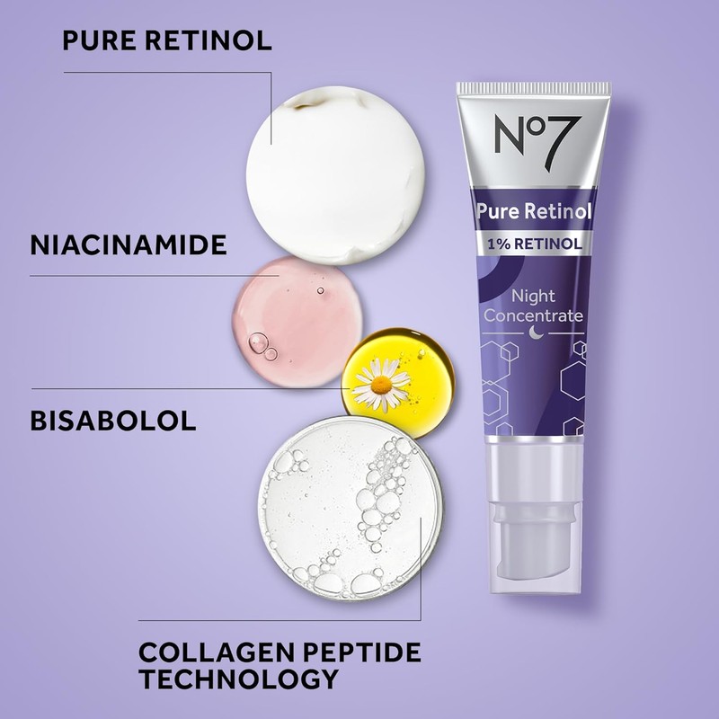 No7 Pure Retinol 1% Retinol Night Concentrate - Anti Wrinkle Retinol Serum with Collagen Peptides & Niacinamide for Younger Looking Skin - Retinol Face Serum for Fine Lines & Wrinkles