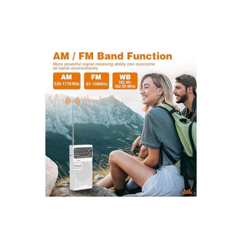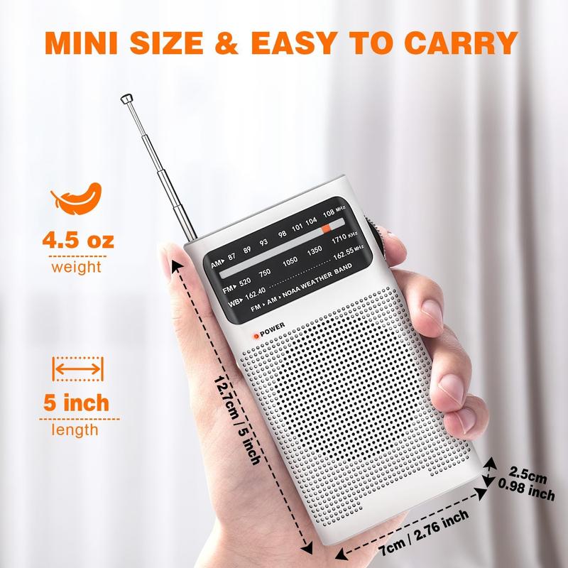 ? Reception?This mini radio is equipped with the DSP chip, 15-inch ultra-long 180? swivel retractable transistor antenna and built-in receiver, supporting WB: 162.400-162.550MHz, FM: 87-108MHz, AM: 520-1710KHz, where you are in the country, you can listen to the local radio easily! local radio stations, where you are in the country or region.