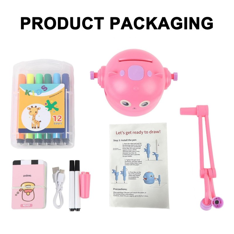 - 【What Will You Get】 1 painting robot, 100 painting and text cards, 1 USB charging cable, 12 pens of various colors, 1 painting pen for the robot.