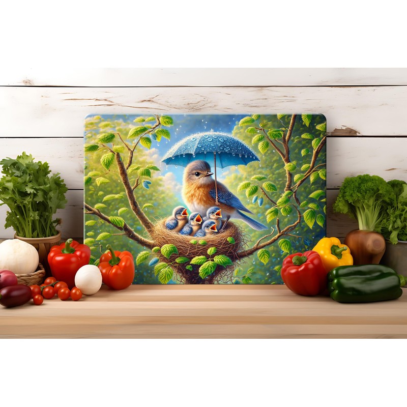 - Enchanted Bluebird Family Design – Features a delicate watercolor scene of a mother bluebird feeding her chicks in a nest, perched in a lush green tree during a gentle rain shower, with the mother bird holding a tiny umbrella.