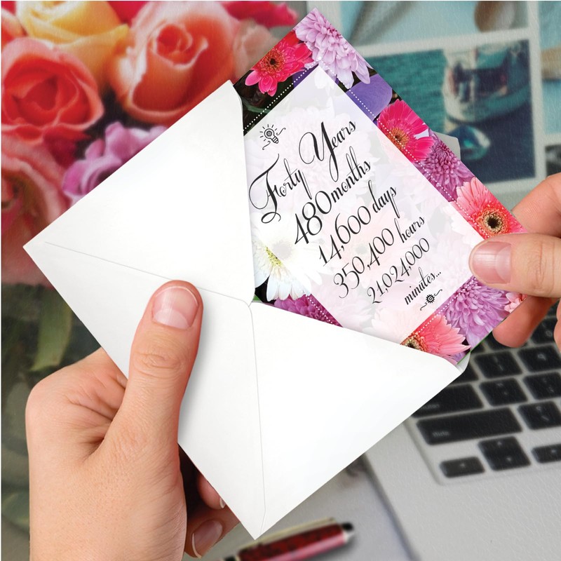 - INSIDE GREETING: "Here 40 years and still counting. Happy Work Anniversary!" COVER - Forty years, 480 months, 14,600 days, 350,400 hours, 21,024,000 minutes...