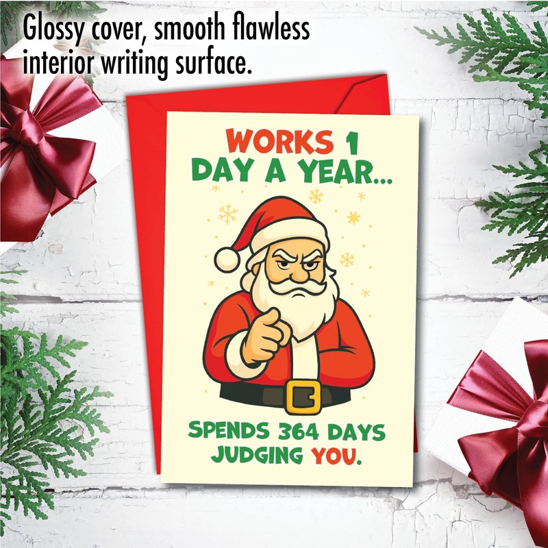 - INSIDE GREETING: "Naughty or nice, have a Merry Christmas!" COVER - Works 1 day a year... Spends 364 days judging you.
