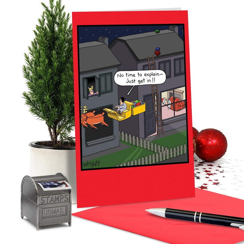 NobleWorks - Funny Merry Christmas Note Card with Envelope (4.63 x 6.75 Inch) - Happy Holidays Greeting Card for Men, Women, Cartoon Xmas Stationery - Just Get In 1200