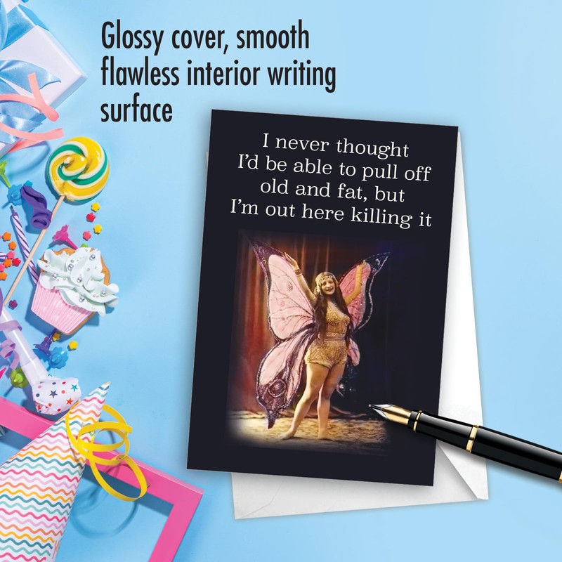 - INSIDE GREETING: "Happy Birthday, Gorgeous!" COVER - I never thought I'd be able to pull off old and fat, but I'm out here killing it.