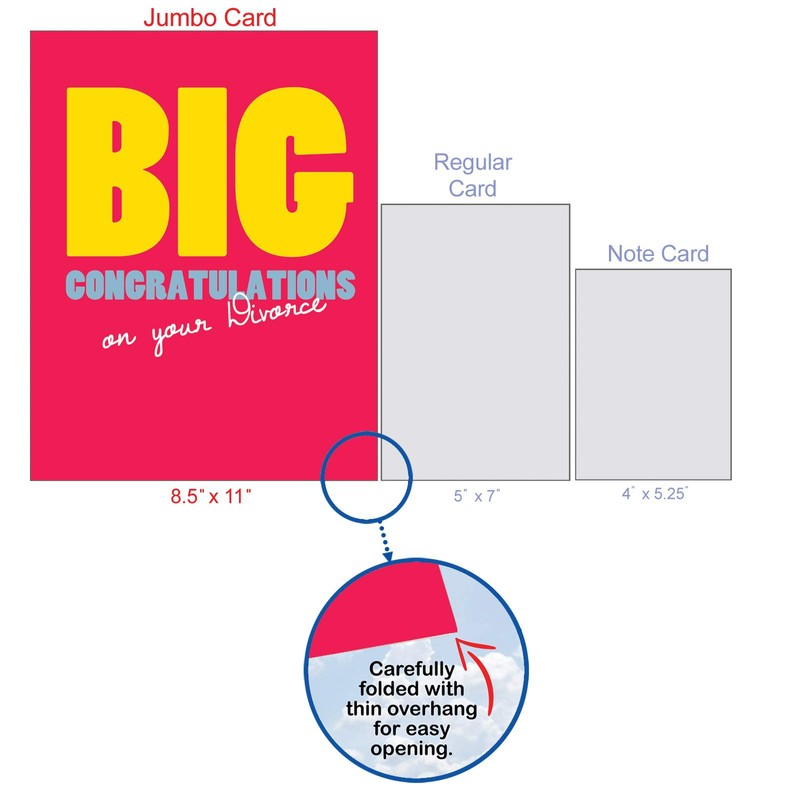 - JUMBO SIZED - Your extra-large wishes for a newly divorced friend requires this 8.5 x 11 inch card. It's described as oversized compared to ordinary notecards. It ships pre-folded in a protective wrapper with a mailing envelope for your convenience.