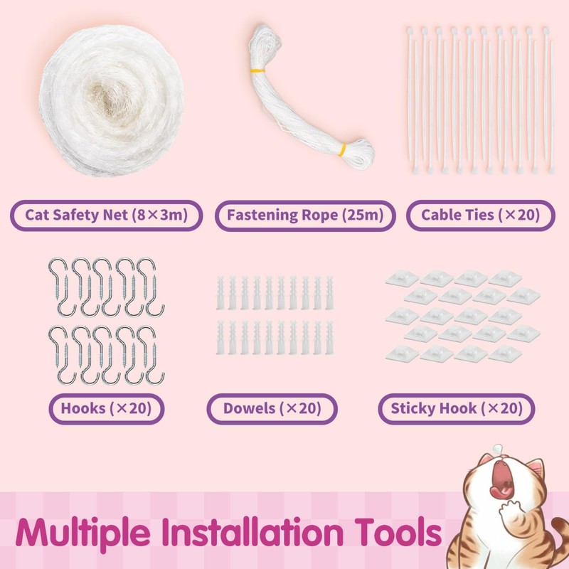 - Package includes: the package contains an 8 x 3 m net, 20 cable ties, 20 adhesive hooks, 20 dowels, 20 hooks and a super strong 25 m long mounting rope. An instruction manual is also included.