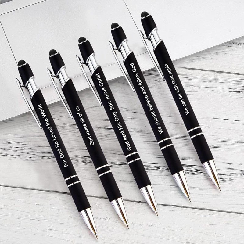 Thank you for your understanding!"About this item 5 pack ball point pens set, engraved with John 3:16 Bible verses. Great gifts for Christians, churches, prayers and devotional use. Ideal for Bible study, sermon notes, faith-based writing and more. Black ink, smooth writing. Functional design with touchscreen stylus tips; the soft rubber tip allows use on most touch screens. Product dimensions: 7.68 x 4.61 x 0.59 inches.