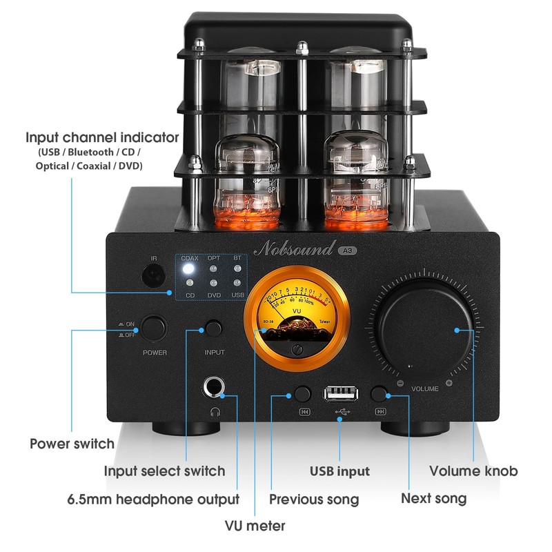 Nobsound A3 Hi-Fi Vacuum Tube Amp 2 Channel Bluetooth Amplifier Receiver for Speakers DAC with Optical USB Input, Subwoofer Output and Headphone Jack, VU Meter, Remore Control for Home Audio System
