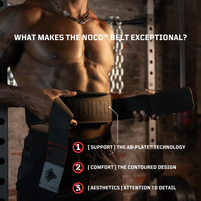 - REVOLUTIONARY DESIGN: The NoCo Lifting Belt revolutionizes traditional lifting belt design by addressing a critical yet often overlooked aspect: frontal support. While many lifting belts prioritize back support, the NoCo belt introduces ground breaking Ab-Plate technology, the first of its kind, dedicated to providing essential frontal support.