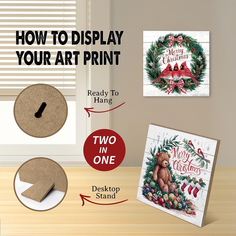 NOCTMETEOR 2Pcs Christmas Wall Art Wooden Sign, Christmas Cardinal Wreath Toy Bear Wall or Desk Decor for Home, 8x8 Inch