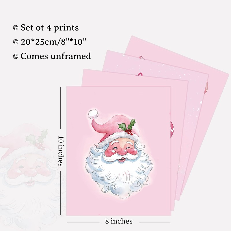 NOCTMETEOR 4Pcs Pink Santa Christmas Tree Wall Art, Pink Christmas Decorations for Bedroom Girlsroom, 8x10 Inch Unframed