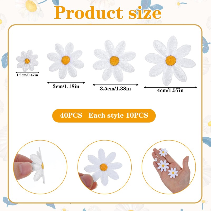 • 40 hochwertige Gänseblümchen-Patches: Enthält 40 weiße blumen bügelbilder in 4 praktischen Größen (1,2 cm bis 4 cm) für präzise Dekoration oder Reparatur.