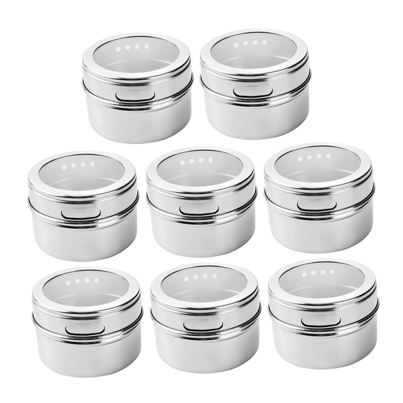 NOLITOY 8pcs Magnetic Stainless Steel Spice Jars with Transparent Lids Airtight Storage Canisters for Refrigerator Kitchen Organization Includes Stickers for Easy Labeling