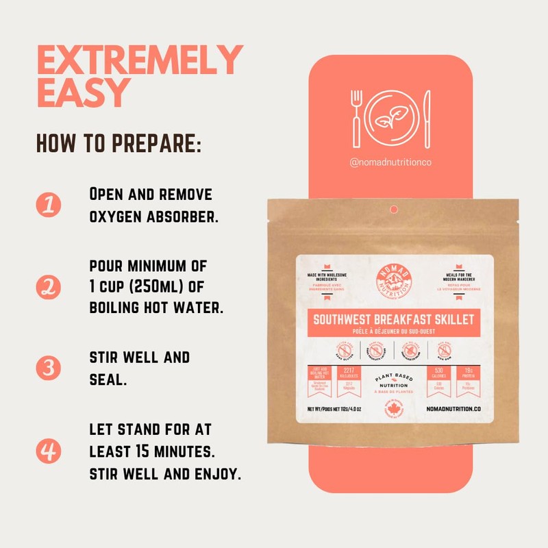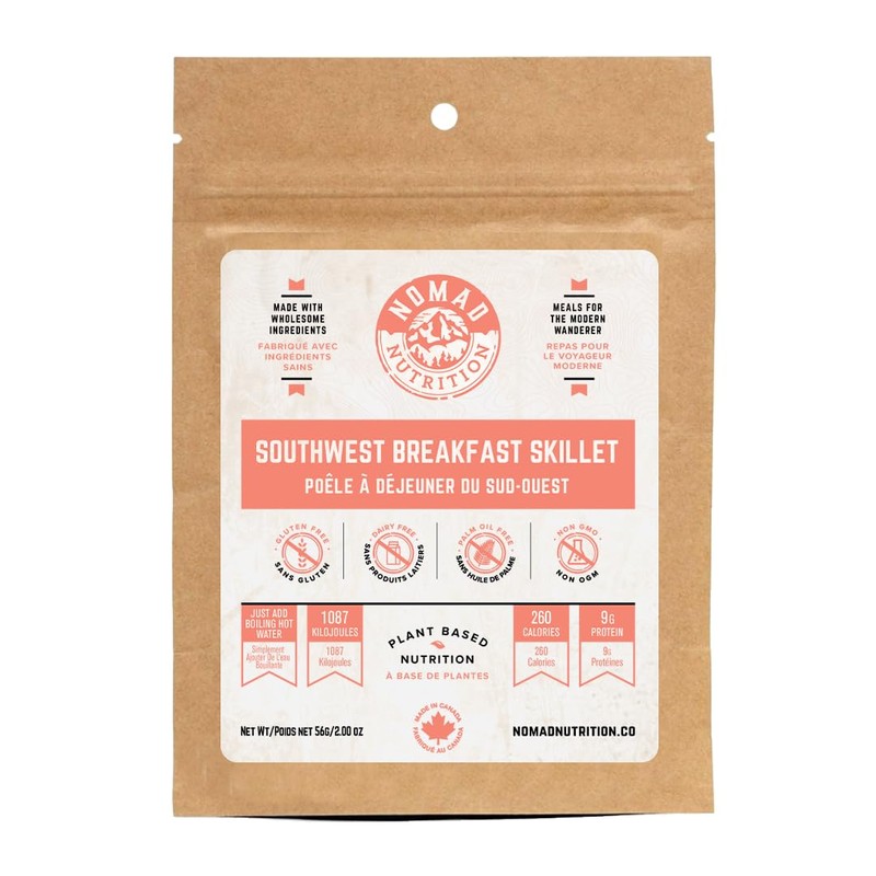 - π€π¨πππ & πππ¦π¬ - Donβt have time to cook, but craving something wholesome and tasty? Our Southwest Breakfast Skillet can be ready in minutes with just a bit of boiling water. Nomad Nutritionβs Southwest Breakfast Skillet is your answer to a quick, nutritious, and hassle-free meal anytime, anywhere
