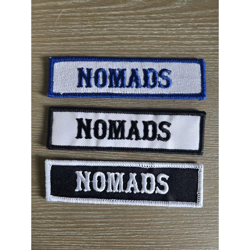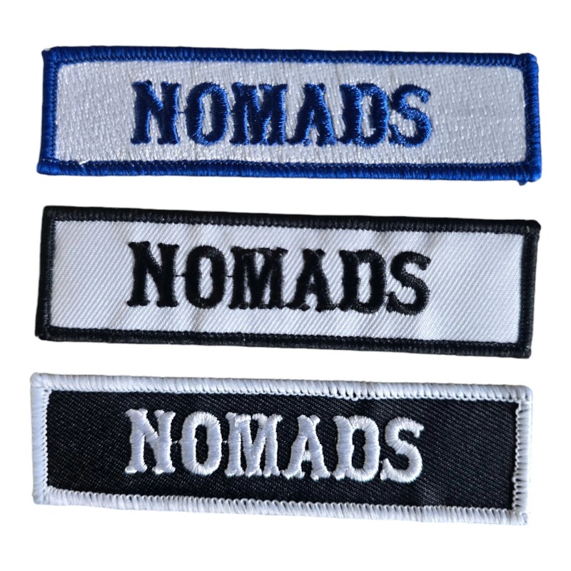 NOMADS MC MOTORCYCLE BIKER CLUB RANK OFFICER TITLE VEST JACKET IRON ON PATCH - White Base w/ Blue Border + Blue Text