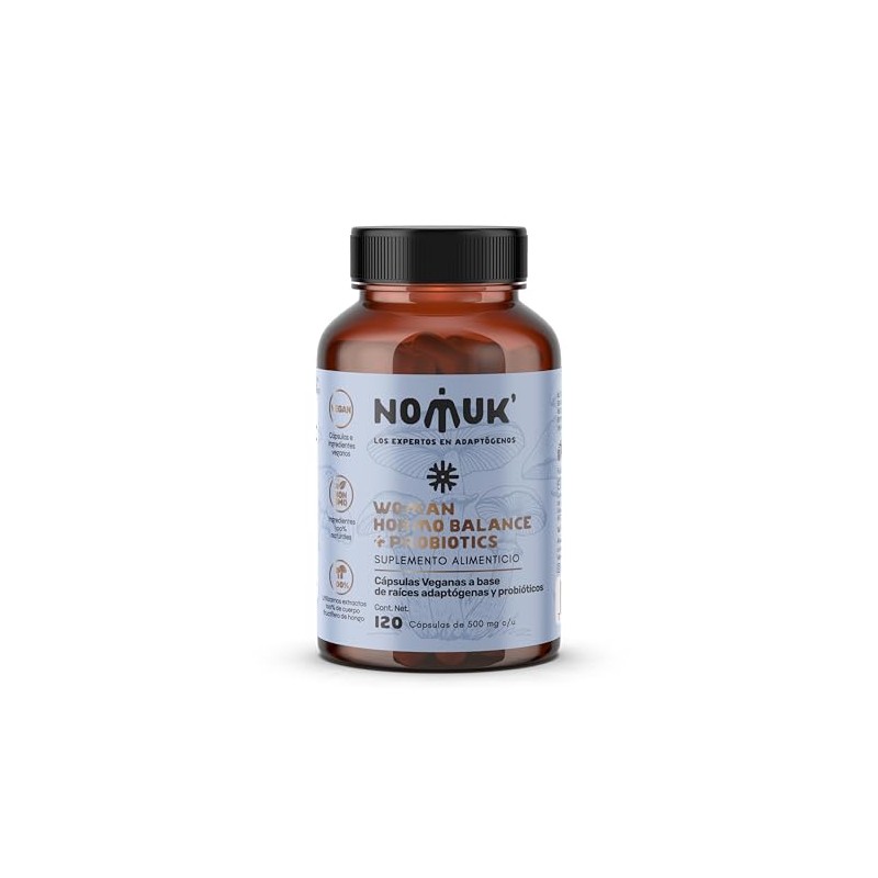 Nomuk Hormo Balance + probióticos para mujeres, suplemento con raíz de Shatavari, Maca, Schisandra y extracto de Ginseng, reduce los cambios de humor, apoya la regulación hormonal, energía equilibrada, raíces adaptógenas, cepas probióticas orgánicos para
