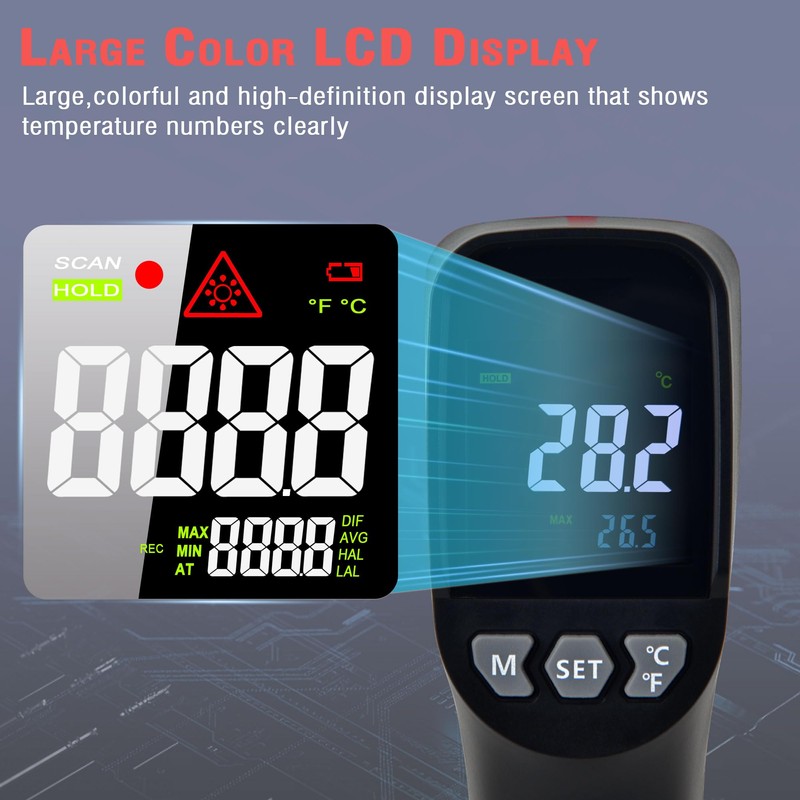 - [ Large Color LCD Display with Backlight ] : This thermometer has a large,colorful and high-definition display screen that shows temperature numbers clearly,which makes this infrared laser thermometer stand out.Backlit display for easy temperature reading even in the dark.