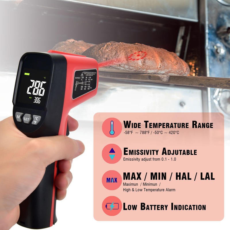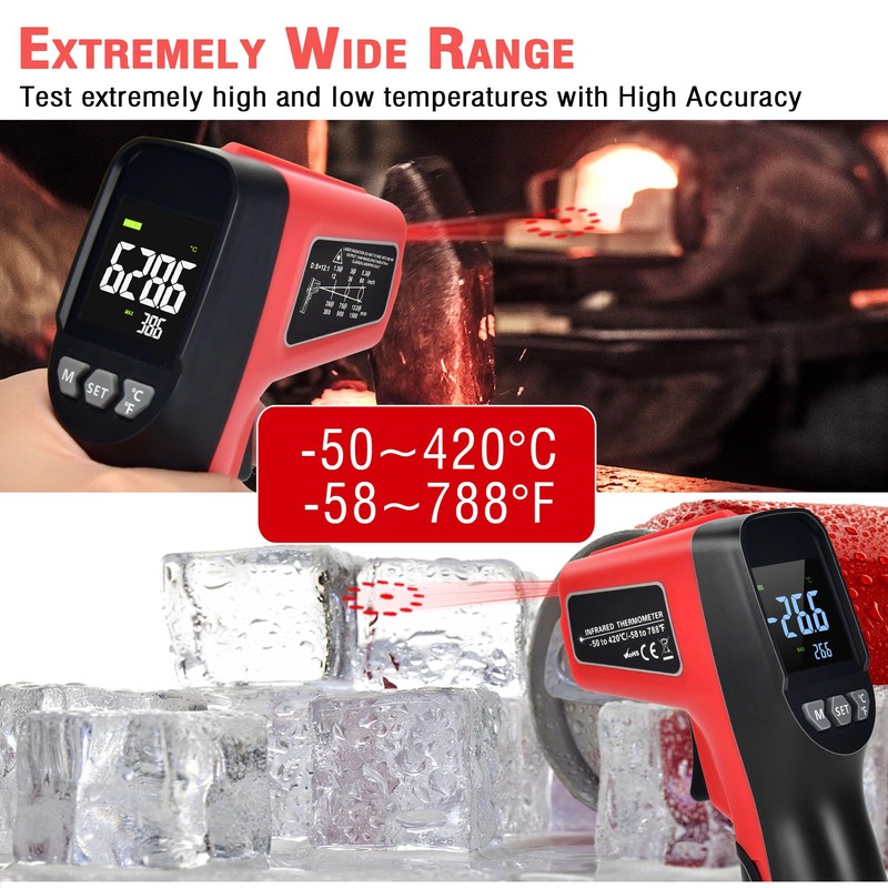 - [ High Accuracy & Adjustable Emissivity ] : Handheld Infrared Thermometer to measure the surface temperature of various objects from 50~420°C/ -58~788°F; Adjustable Emissivity from 0.1–1.0 to match the surface material being measured which improves measurement accuracy