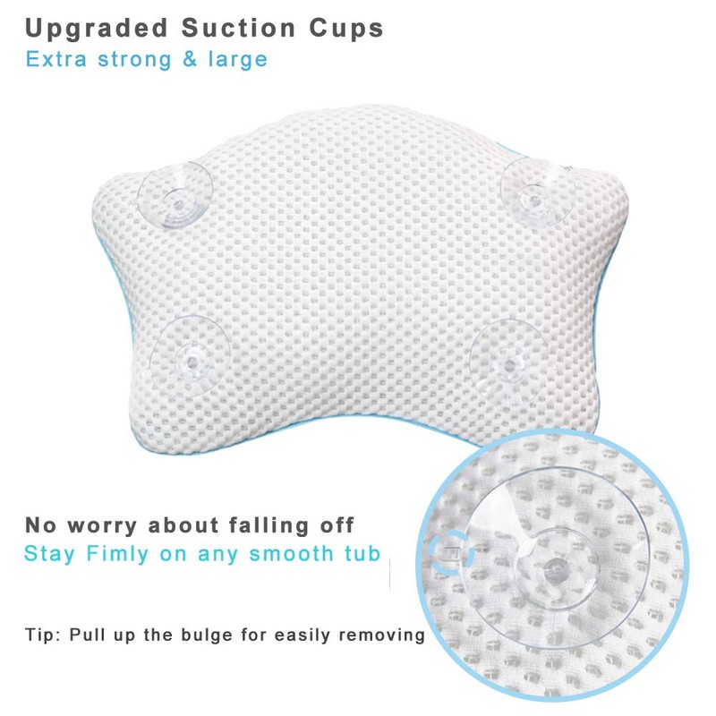 - ★ FITS ANY TUB - 4 upgraded suction cups are more powerful and stitched by cut-resistant threads, no worries about falling off, allowing this bath pillow stays firmly on any smooth surface, fits any size tub. ERFECTLY COMPACT for convenience and portability. Use the cloud bath pillow anywhere and anytime you want to relax.