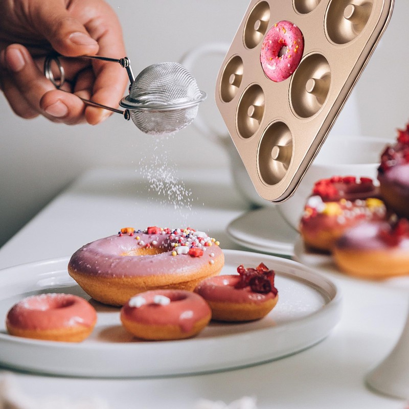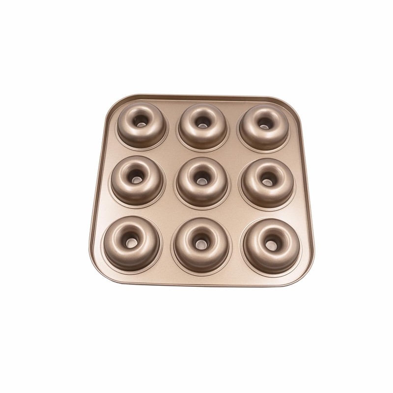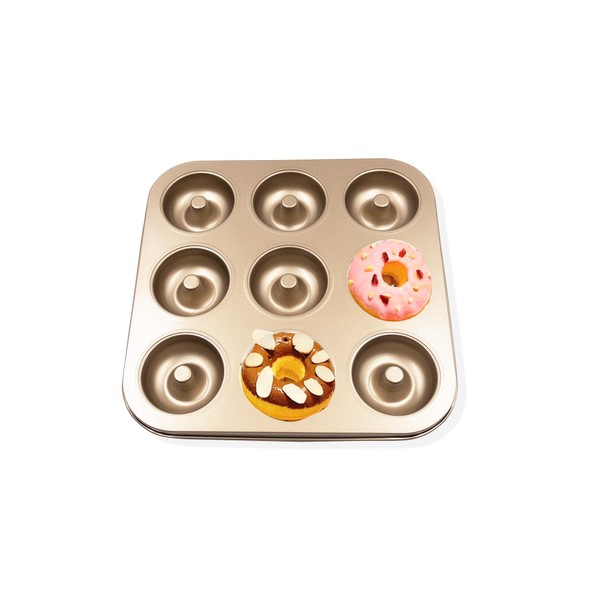 Non Stick Donut Mould 9-Cavity Cupcake Tins Carbon Steel Baking Tray for Doughnut Muffin Cupcake, Gold (One Style)