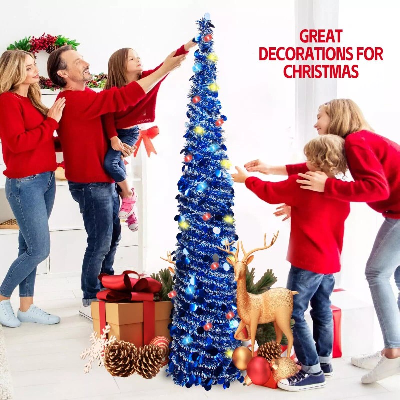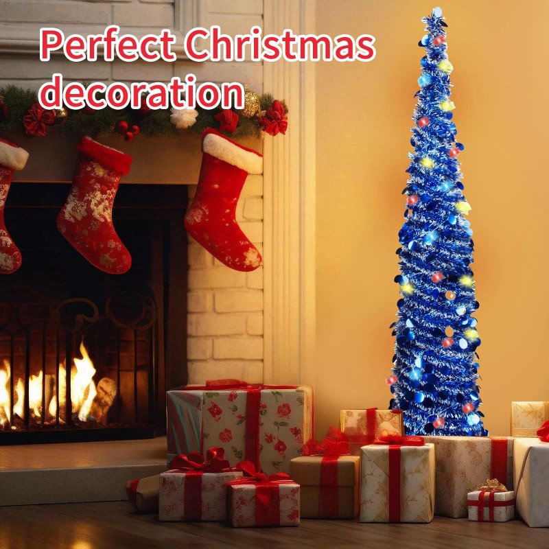【5FT Pop Up Skinny Pencil Tinsel Christmas Tree】Featuring a slender design that is perfect for spaces with limited room. This pop Up Christmas tree stands at a height of 5 feet, adding a touch of festive charm to your home without taking up too much space.