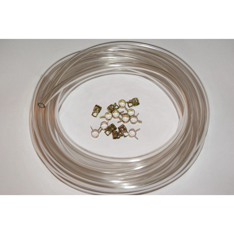 ITEM UP FOR SALE IS 5 FT OF CLEAR 1/4IN FUEL LINE HOLE WITH 3/8 OUTSIDE MEASUREMENT AND 15 FUEL LINE CLAMPS.REPLACE THAT WORN OUT FUEL LINE AT A GREAT PRICE.CHECK YOUR SIZE BEFORE BUYING TO SEE IF THIS WHAT YOU NEED.IF YOU NEED 3/16 FUEL LINE HOLE CHECK OUT ITEM NUMBER 141583056860.