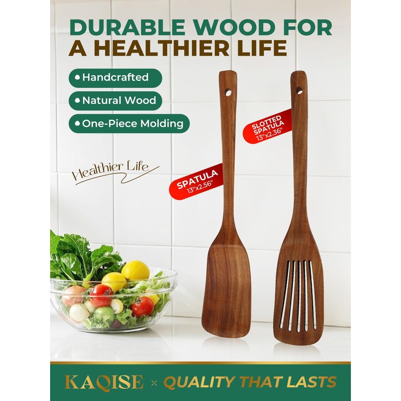 - 【Handcrafted from Natural Wood】Each piece in this set is handcrafted from 100% natural teak wood, ensuring exceptional quality and attention to detail. The Wooden Kitchen Utensils are carefully shaped and polished by skilled artisans, preserving the rich texture and unique grain of the wood. This artisanal craftsmanship guarantees a durable and beautiful Wooden Cooking Utensil Set that adds a touch of elegance to any kitchen while offering long-lasting performance.