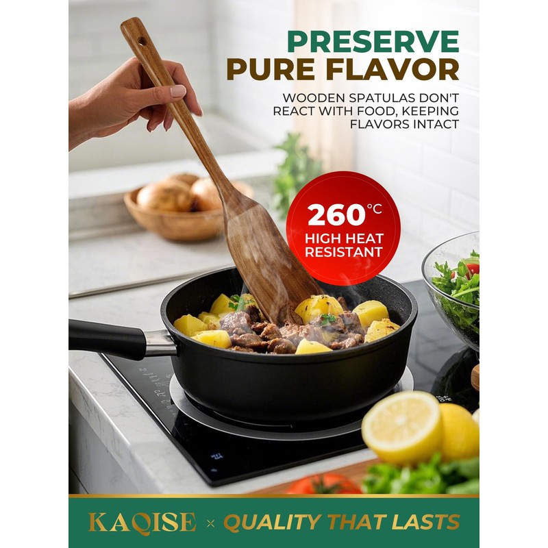 - 【Heat-Resistant & Durable】Our meticulously crafted Teak Wood Utensil Set is designed to withstand high temperatures. Whether you're frying or braising, these Wooden Kitchen Utensils won’t warp or crack under heat. Their exceptional Durability ensures they'll remain an indispensable tool in your kitchen for many years to come.