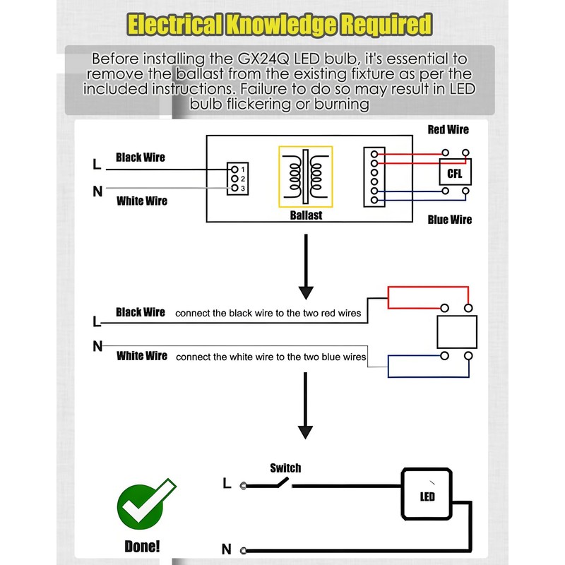 - Important Reminder: Prior to installation, remove the 4 pin led light bulb’s ballast from the existing fixture. This GX24Q LED bulb isn't a direct replacement for the original CFL bulb. Electrical knowledge is necessary for proper installation and safety