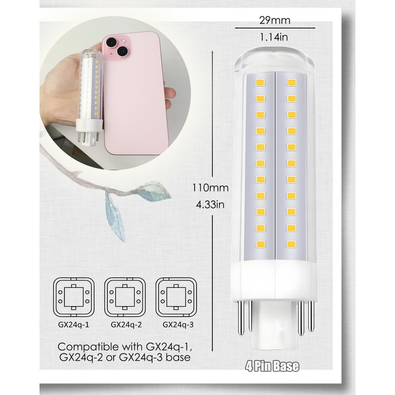 - Lamp Holder Compatibility: The 4 pin light bulb is compatible with the GX24Q-1 GX24Q-2 and GX24Q-3 bases. Check size beforehand for proper fit. This GX24Q-3 LED bulb offers a wide 360-degree beam angle, flexible for various GX24Q fixtures