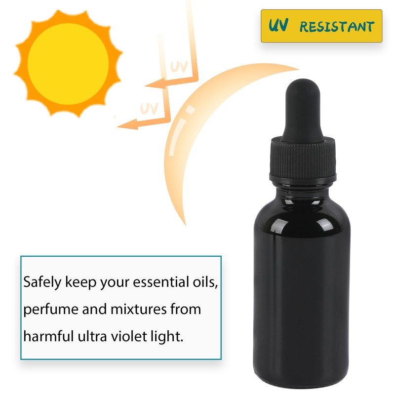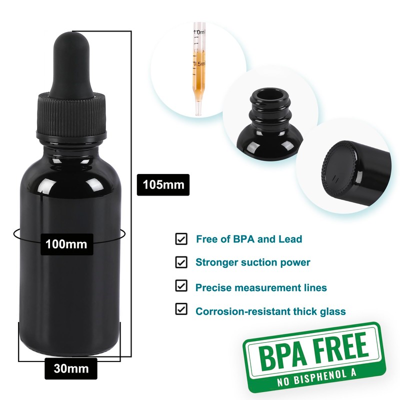 - 🧴【High-quality Materia】These black glass dropper bottles are made of corrosion-resistant thick glass and silicone tops,never absorb the flavors, they shelter photosensitive compounds from damaging UV rays. Safely keep your mixtures.