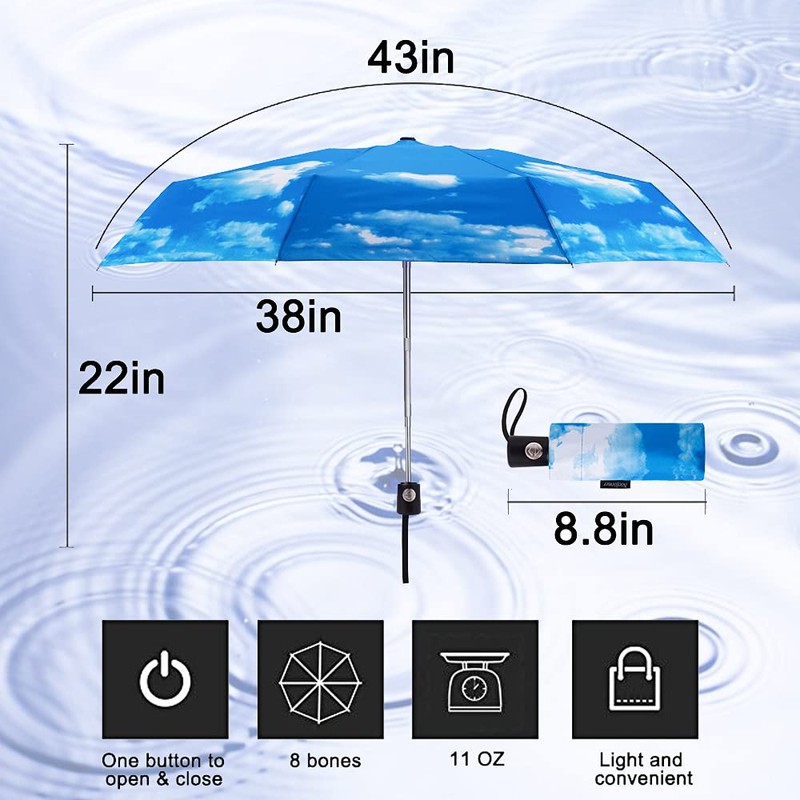 • Weight( 11oz),Length(8.8in).A little more the the weight & length of a pad mini.You can see that the ordinary automatic umbrellas are big & heavy and mini umbrellas are so difficult to open/closed as the reviews customer left.So,we produced this auto open/close small umbrellas.It opens to form a large 38'' diameter coverage,fitting perfectly in your makeup bag,briefcase,suitcase or kids backpack.It is also ideal gift for parents,friends,colleagues.